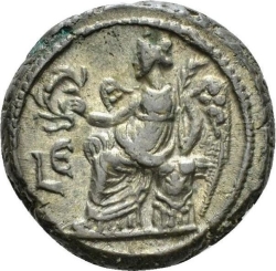 L Ε; Zeus seated left, holding patera and sceptre; at feet left, eagle