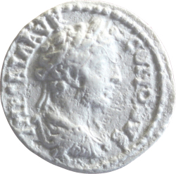 [IP(sic)?] CAI(sic) L A COMODVS (L shaped as Λ); bare head of Commodus (youthful), right