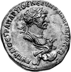 ΑΥΤΟ ΚΑΙϹ ΤΡΑΙ ΑΔΡΙΑΝΟϹ ΑΡΙ ϹΕΒ ΓΕΡΜ ΔΑΚ ΠΑΡΘ;  laureate and cuirassed bust of Hadrian, right  ΔΗΜΑΡΧ ΕΞΟΥϹΙΑϹ;  eagle with wings spread standing facing on club, head left; in right field, palm