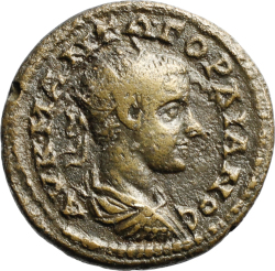 Æ (26 mm)   11.16 g. 																							  ΑΥΤ Κ ΜΑΡ ΑΝΤ ΓΟΡΔΙΑΝΟϹ;  radiate, draped and cuirassed bust of Gordian III, right, seen from front  ΚΟΙΝΟΝ ΜΑΚΕΔΟΝΩΝ Β ΝΕΩΚΟΡ;  two temples facing each other, seen from a three-quarter view; in top field, two agonistic crowns