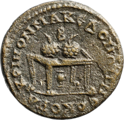 Æ (26 mm)   10.47 g. 																							  ΑΥΤ Κ ΜΑΡ ΑΝΤ ΓΟΡΔΙΑΝΟϹ;  radiate, draped and cuirassed bust of Gordian III, right, seen from front  ΚΟΙΝΟΝ ΜΑΚΕΔΟΝΩΝ ΝΕΩΚΟΡΩΝ, Β;  agonistic table seen in perspective from right, holding two prize crowns with palm