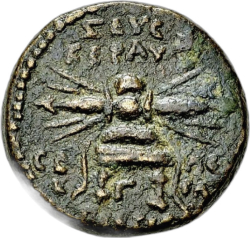 ΖΕΥϹ ΚΕΡΑΥ ϹΕΛΕΥΚΕΩ(Ν) ΠΙΕΡΙ(ΑϹ) (and numeral letter Α or Ε, Ζ reversed); thunderbolt on cushion placed on stool; in upper right field, star; (in lower right, field, second star)