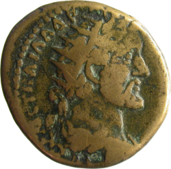[ΑΥΤ] [Κ]ΑΙϹ ΤΙΤ ΑΙΛ ΑΔΡΙ ΑΝΤω[ΝΕ]ΙΝΟϹ [ϹΕΒ [ΕΥϹΕ?]; radiate head of Antoninus Pius, right