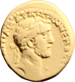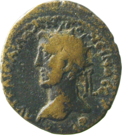 ΑΥΤ ΚΑΙ ((Τ(Ι)) Α(Ι(Λ)) Α(ΔΡ(Ι)) ΑΝΤωΝΕΙΝΟϹ Ϲ(ΕΒ(Α)) ΕΥ; laureate head of Antoninus Pius (with traces of drapery), right