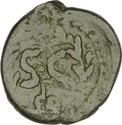 S C (and above, numeral letter); turreted, veiled and draped bust of Tyche, right; below, ram