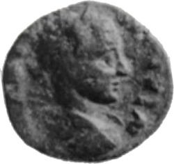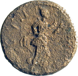 C G I H PA; uncertain female figure (Minerva/Athena or local heroine?) standing, facing, head, right, holding harpa and bearded head