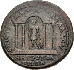 ΕΠΙ ϹΤΡ ΚΑΛΕϹ ΘΑΛΛΟΥ, ΜΗΤΡΟΠΟΛΕΙΤΩΝ; temple with four columns enclosing Ares standing left, holding spear and shield
