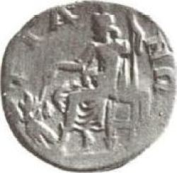 ΗΡΑΚΛΗΑϹ ΠΟΝΤΩ; Dionysus nude seated left on a pile of ricks, looking back, his right arm over his head, holding transverse thyrsus in his left hand