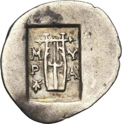 cithara in incuse square; mint initials ΜΥΡΑ (and symbol) in field