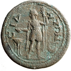 Apollo Sidetes standing left, holding patera and sceptre