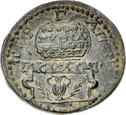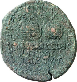ΑϹΥΛΕΙΑ ΑΥΓΟΥϹΤΕΙΑ, ΠΕΡΓΑΙΩΝ, ΙΕΡΟΙ ΟΙΚΟΥΜΕΝΙΚΟΙ; inscribed table on which sit two prize crowns with palms