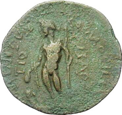 ΙοΥΛΙΕΩΝ ΤΩΝ ΚΑΙ ΛΑοΔΙΚΕωΝ Πο ΜΑΡ (ωs may be shaped as Us); nude Dionysus standing, left, holding cantharus and chlamys over panther and long thyrsus