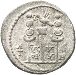 AVGVSTORVM; legionary eagle with wreath in beak, right, surmounting stand (aquila) between two standards