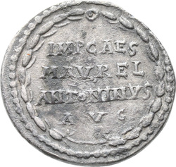 IMP CAES M AVREL ANTONINVS AVG; in four lines in laurel wreath