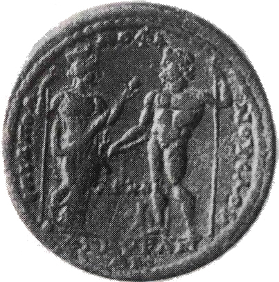 Hera standing right, holding pomegranate (?) and sceptre, facing Zeus standing left, hoding anchor and sceptre; at his feet, left, eagle |
