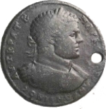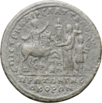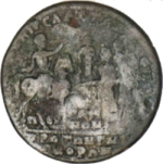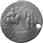 Caracalla on horseback right, rising right arm, facing male figure (citizen) standing left, holding small statue of Ascelpius standing facing, holding serpent-staff; on the right, two soldiers (?) standing right, each holding standard (?) |