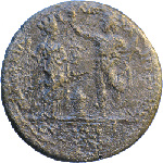 Tyche standing right, holding small statue of Cybele seated and sceptre, facing Perseus standing left, raising wreath, and holding Medusa-head and harpa; between them, lighted altar |