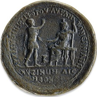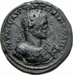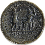 Caracalla, in military dress, standing right, holding transversal sceptre, facing Sarapis seated left, extending arm over Cerberus, holding sceptre |