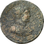 Gaia and Thalassa holding together a statue of Geta (?) standing left, in military dress, holding patera and sceptre; on the right, Gaia is standing left, holding cornucopia over ears of corn; on the left, Thalassa is standing right, holding rudder; between them, below the statue, eagle standing facing, head right, spreading wings, wreath in claws |