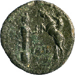 to left, cult statue of Athena Ilias standing right, on short decorated column, wearing kalathos, holding spear and spindle; to right, cow suspended from tree left; in tree, man grasping her horn, slaughtering her with knife