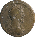 Septimius Severus on horseback right, rising right arm, holding sceptre |