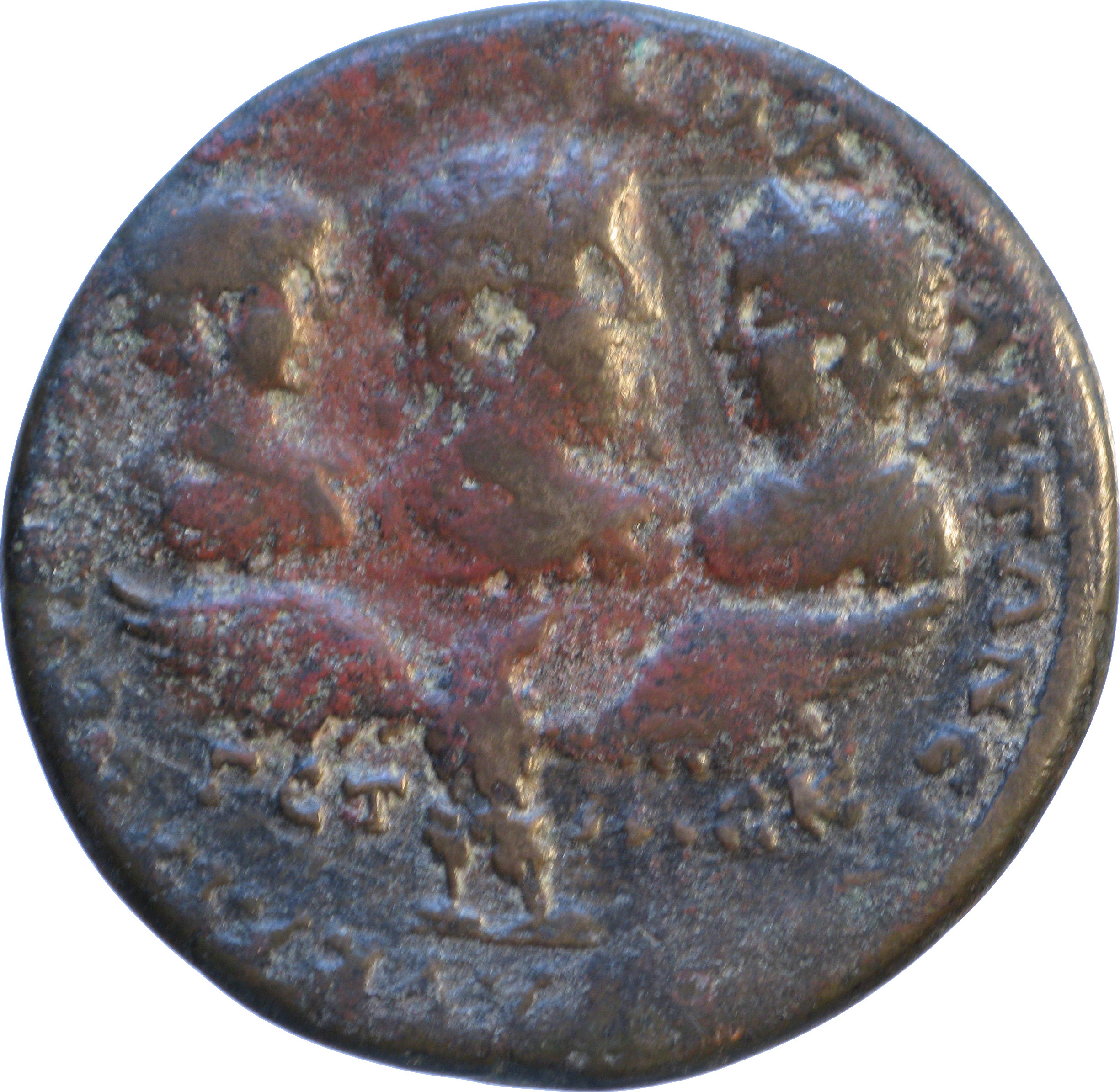 on the left: bare-headed, draped and cuirassed bust of Geta, right, seen from rear; on the middle: laureate, draped and cuirassed bust of Septimius Severus, right, seen from rear; on the right: laureate, draped and cuirassed bust of Caracalla, left, seen from rear; below, eagle facing, spreading wings |
