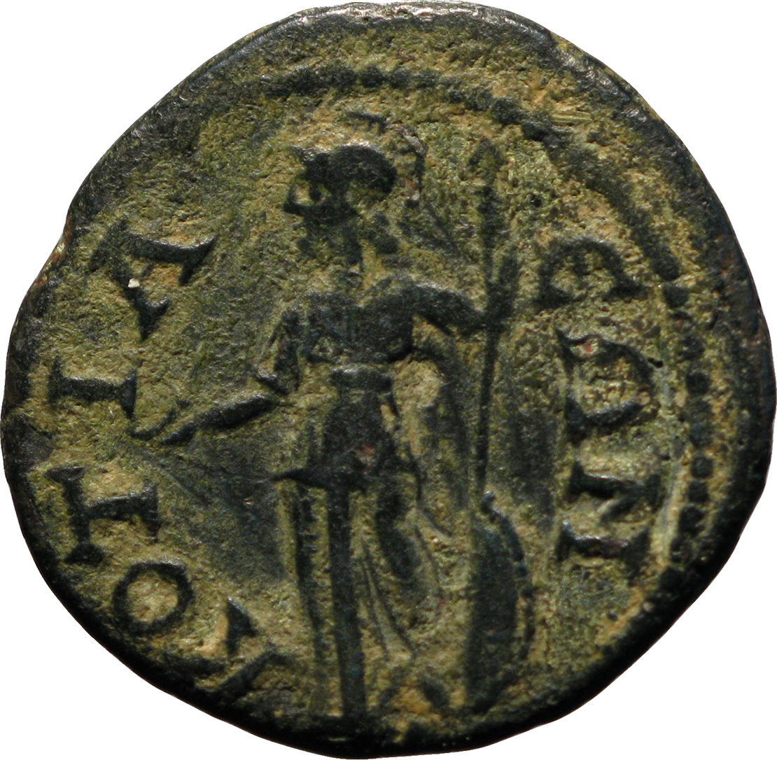 Athena standing left, holding patera and spear; at her feet, shield