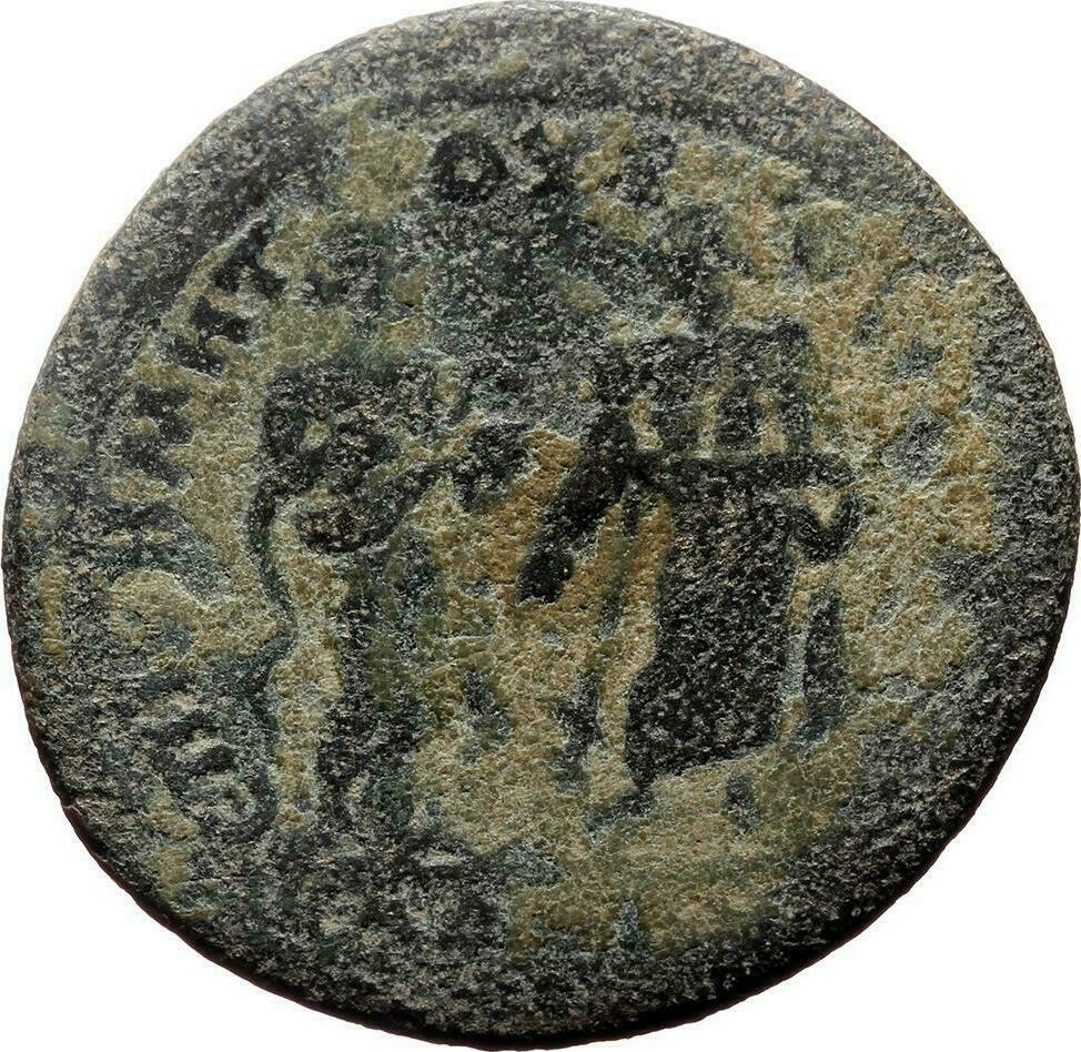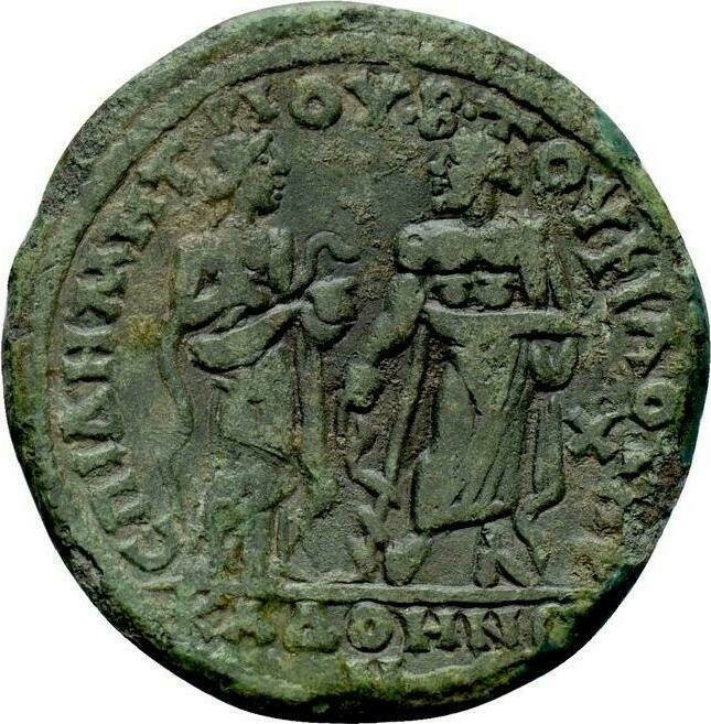 Hygieia standing right, feeding serpent from patera, facing Asclepius standing left, holding serpent staff |