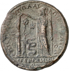 Athena standing left, placing shield on column, holding spear; between Athena and column, tree and serpent coiling right |