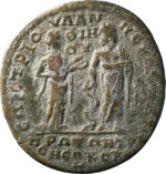 Hygieia standing right, feeding serpent from patera, facing Asclepius standing left, holding serpent staff |