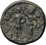 Caracalla or Alexander, in military dress, standing left, holding patera over lighted altar, crowned by the Tyche of Alexandria standing left, holding wreath and vexillum