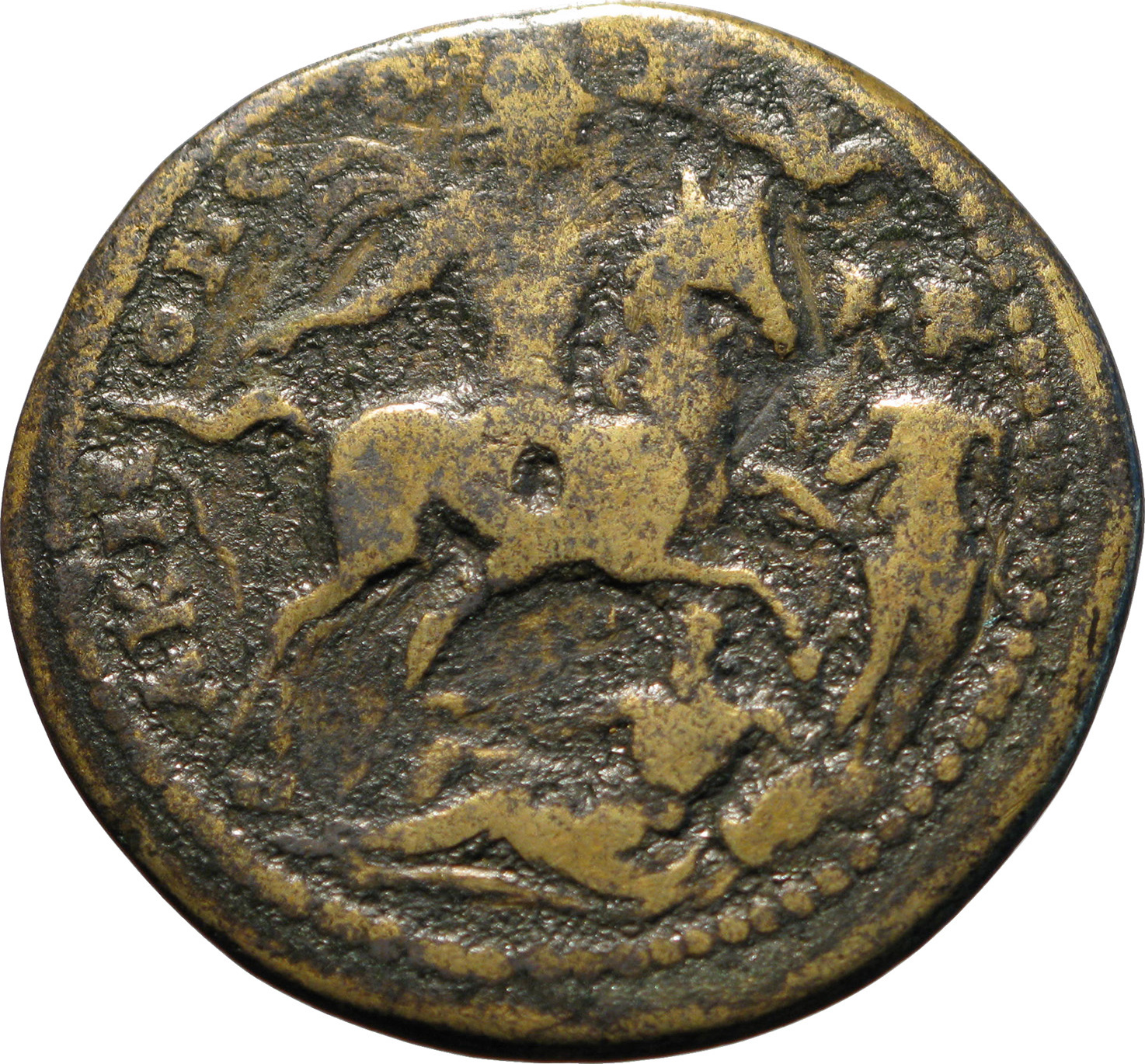hero Akmôn with flying chlamys, holding whip, galloping right, towards Dindymos hill, on which stand two nymphs (Oreiades); at foot of the hill, a river god (Sindros), reclining left
