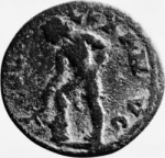 nude Apollo standing with foot on omphalos(?), left, leaning forward, resting elbow on knee, holding branch