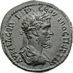 Alexander the Great standing right, head left, at prow of galley right, holding spear and extending right hand, with two soldiers behind him and bust of Athena on acrostolium of galley; on another galley, Athena seated right, holding spear and shield; on the left, herald blowing trumpet on tower |