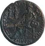 Amazon Smyrna seated left, on prow, head right, holding small statues of two Nemeses (standing, facing each other, each plucking chiton, one holding cubit rule, the other holding bridle) and double axe, resting arm on pelta