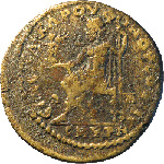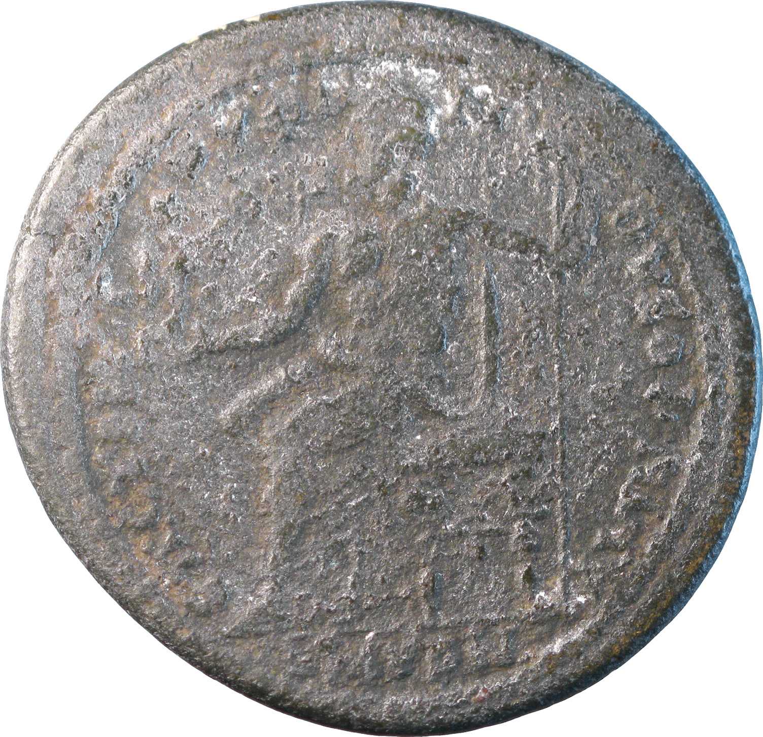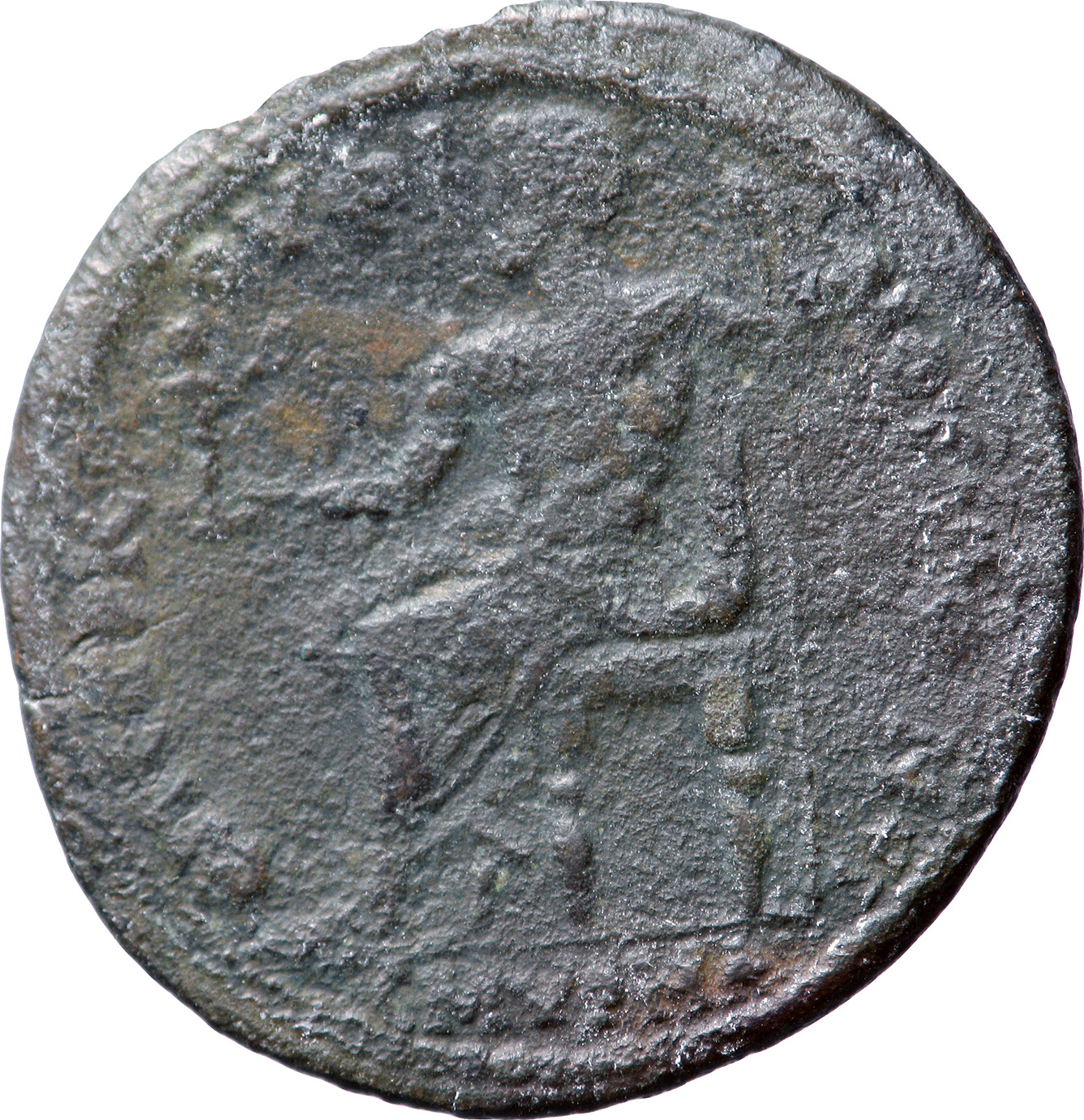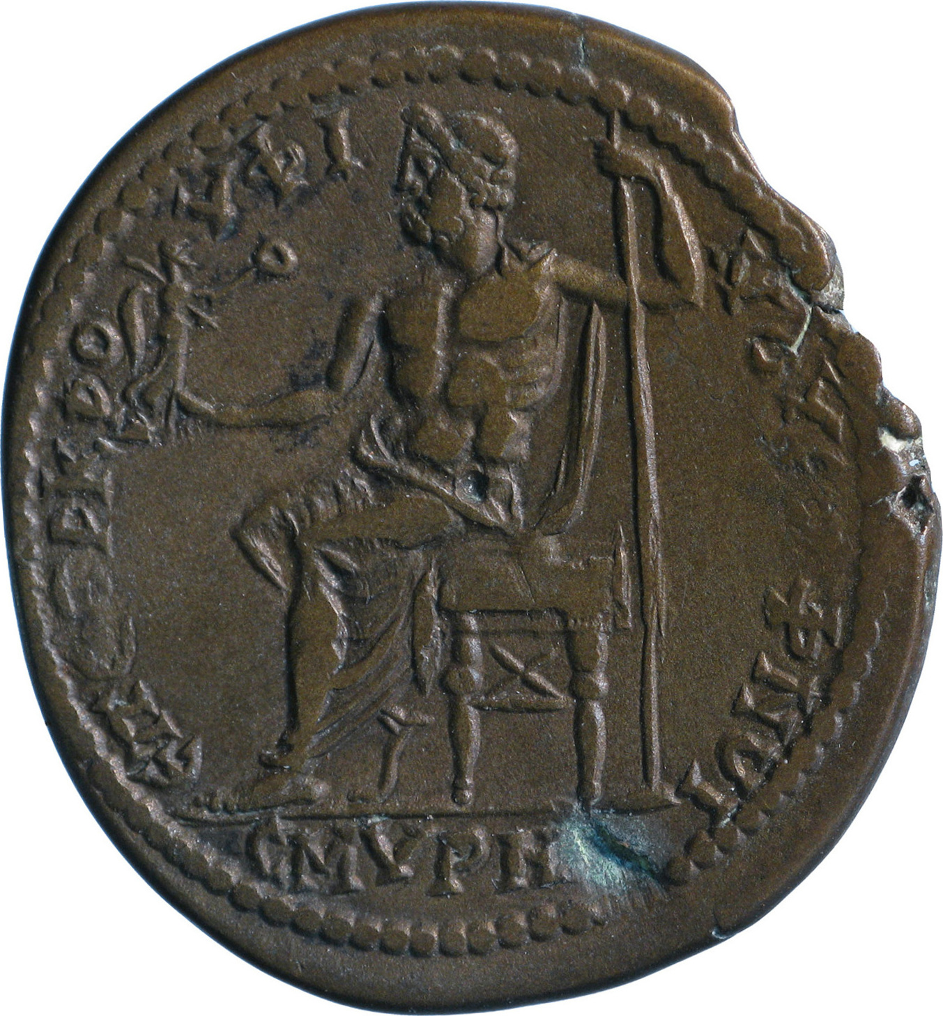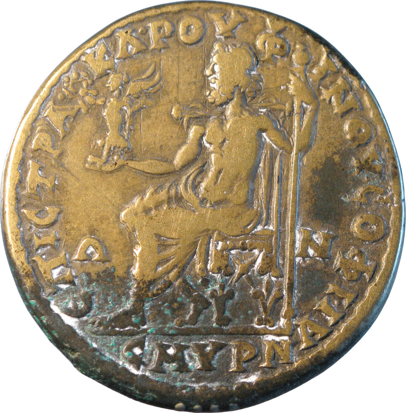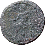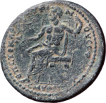 Zeus seated left, holding Nike and sceptre |
