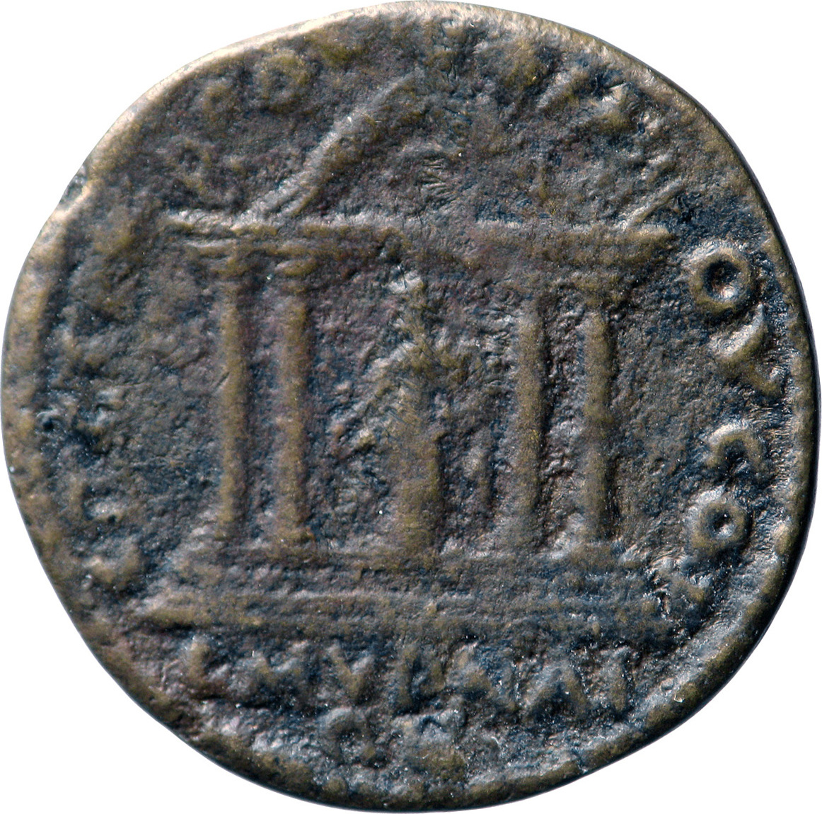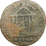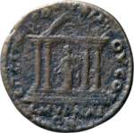 temple with four columns enclosing Tyche standing left, holding rudder and cornucopia |
