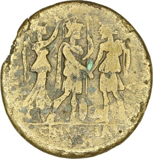 Nike standing right, placing crown on Roma (or Septimius Severus?), standing right, holding spear in left hand, shield at feet, clasping hands with Amazon Smyrna standing left, holding Nike, double axe; prow of ship at feet
