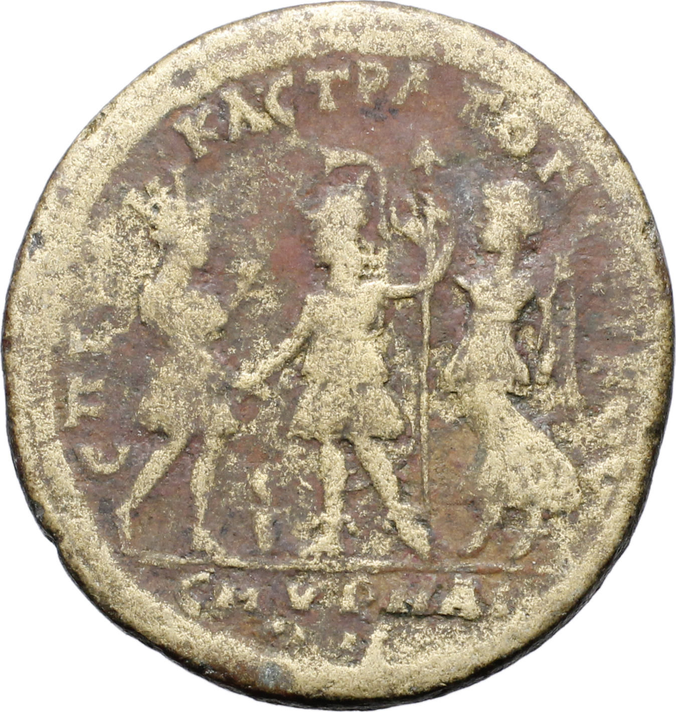 Nike standing left, placing crown on Roma (or Septimius Severus?), standing left, holding spear in left hand, altar at feet, facing Amazon Smyrna standing right, holding double axe (?)