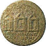 three temples with four columns side by side, each one surmounted by a wreath; in the central temple, statue of Roma seated left |