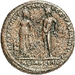 Artemis standing left, wearing kalathos, veiled and draped, holding patera over stag and bow, and Apollo standing left, holding stag and bow |