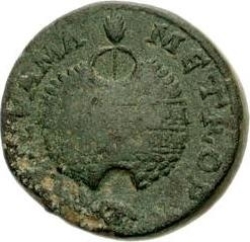 agonistic crown, inscribed, containing palm or cypress branch; below, ram's head