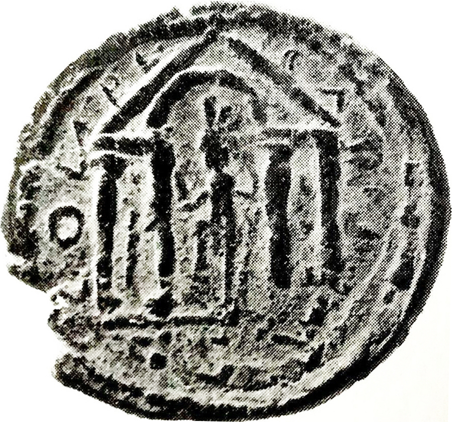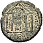 temple with four columns and rounded pediment enclosing statue of Fortuna standing left, with foot on rock, holding human bust and sceptre; on each side, between the columns, two Victories standing on globe, facing each other