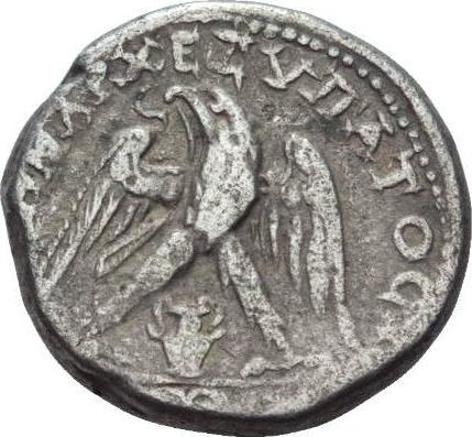 eagle standing on filleted thyrsus, facing, head and tail left, with wings spread, wreath in beak; wine jug between legs