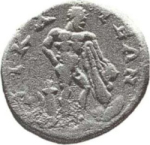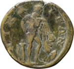 Heracles standing right, right arm behind his back, holding lion skin and club resting on rock; at left, quiver