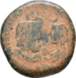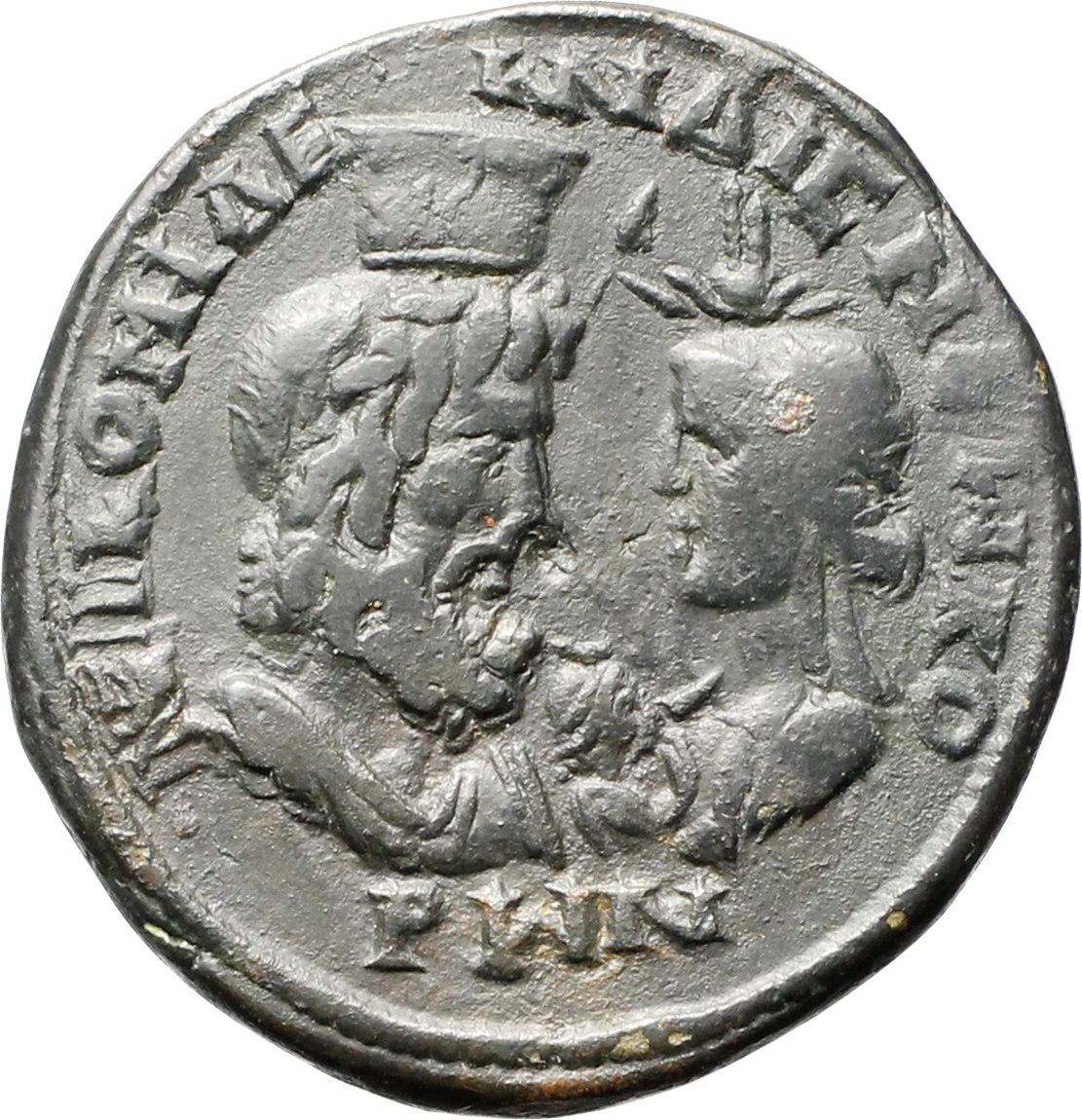 confronted busts of Sarapis, draped, right, and Isis, draped, left; between them, small bust of Horus, right