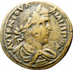emperor in biga (decorated with Tyche holding rudder and cornucopia) advancing left, holding figure of Nike with crown and palm |