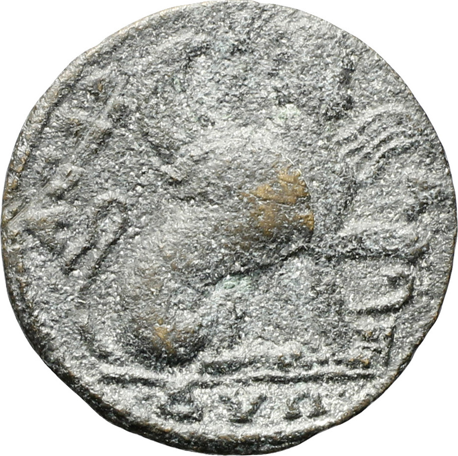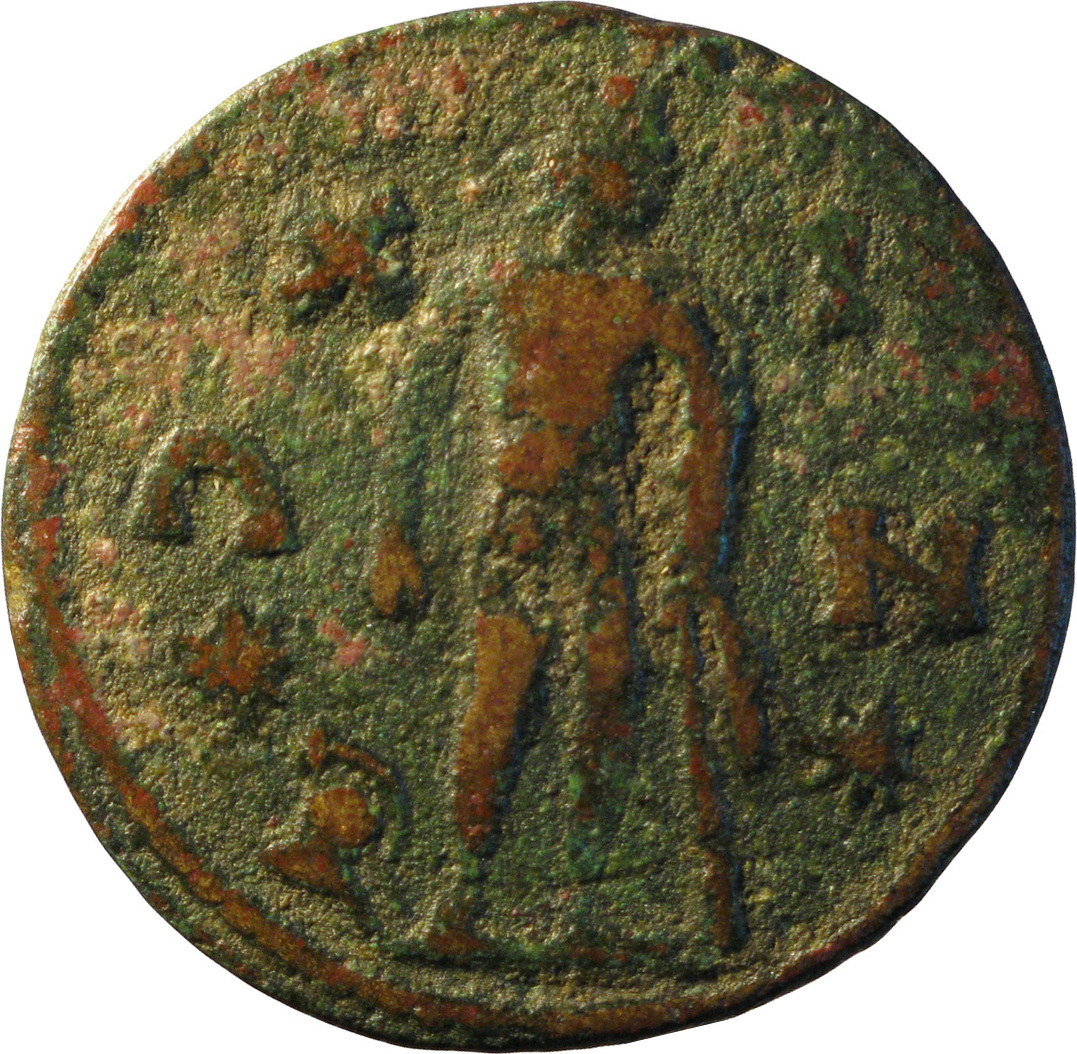 Oinopion standing facing, head right, leaning on staff around which chlamys is wrapped; at his feet, helmet and in field, left and right, star