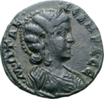 Cybele seated left, holding patera and sceptre, resting arm on tympanum; at feet, lion |