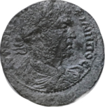 Tyche standing left, holding anchor and cornucopia; at feet, pomegranate |